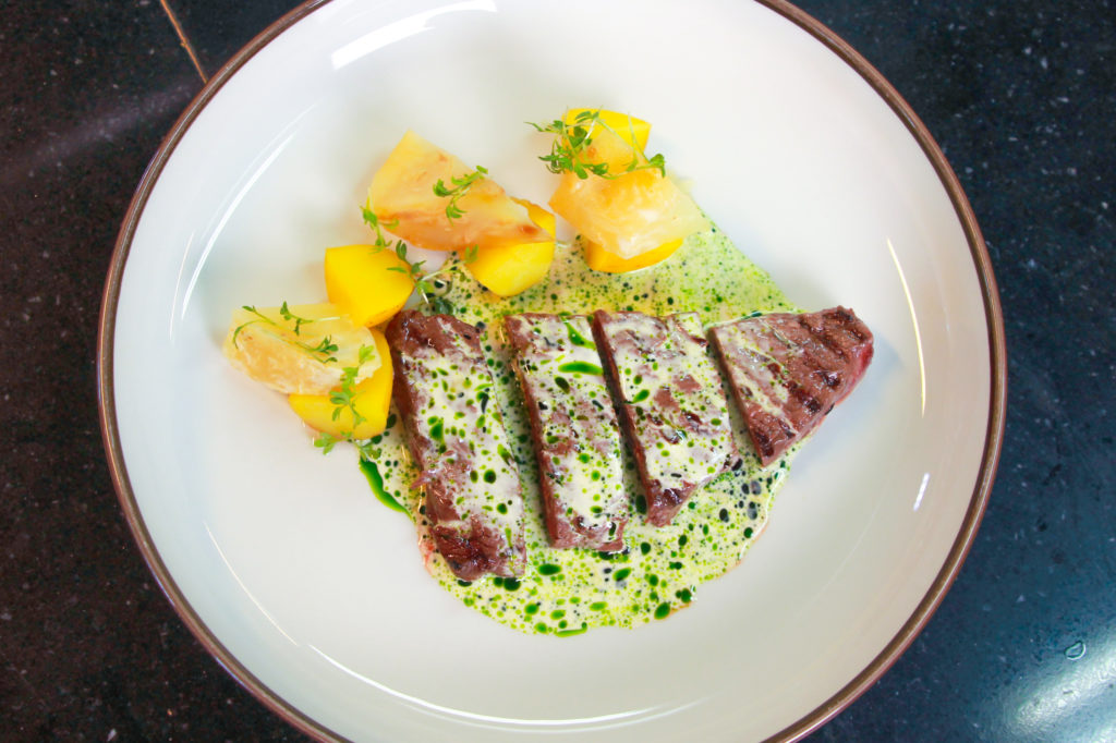 Hvalbiffen skal legges i fryseren for denne forretten. Når den har blitt fast skal den i syltynne biter skjæres med en skarp kniv. Deretter skal skivene pensles med olivenolje, for a så avslutte med salt og pepper.